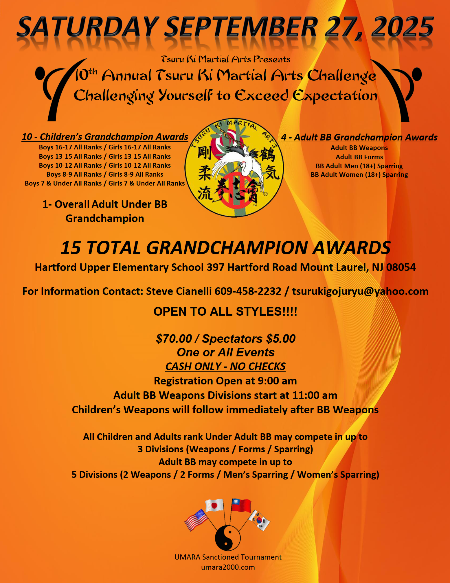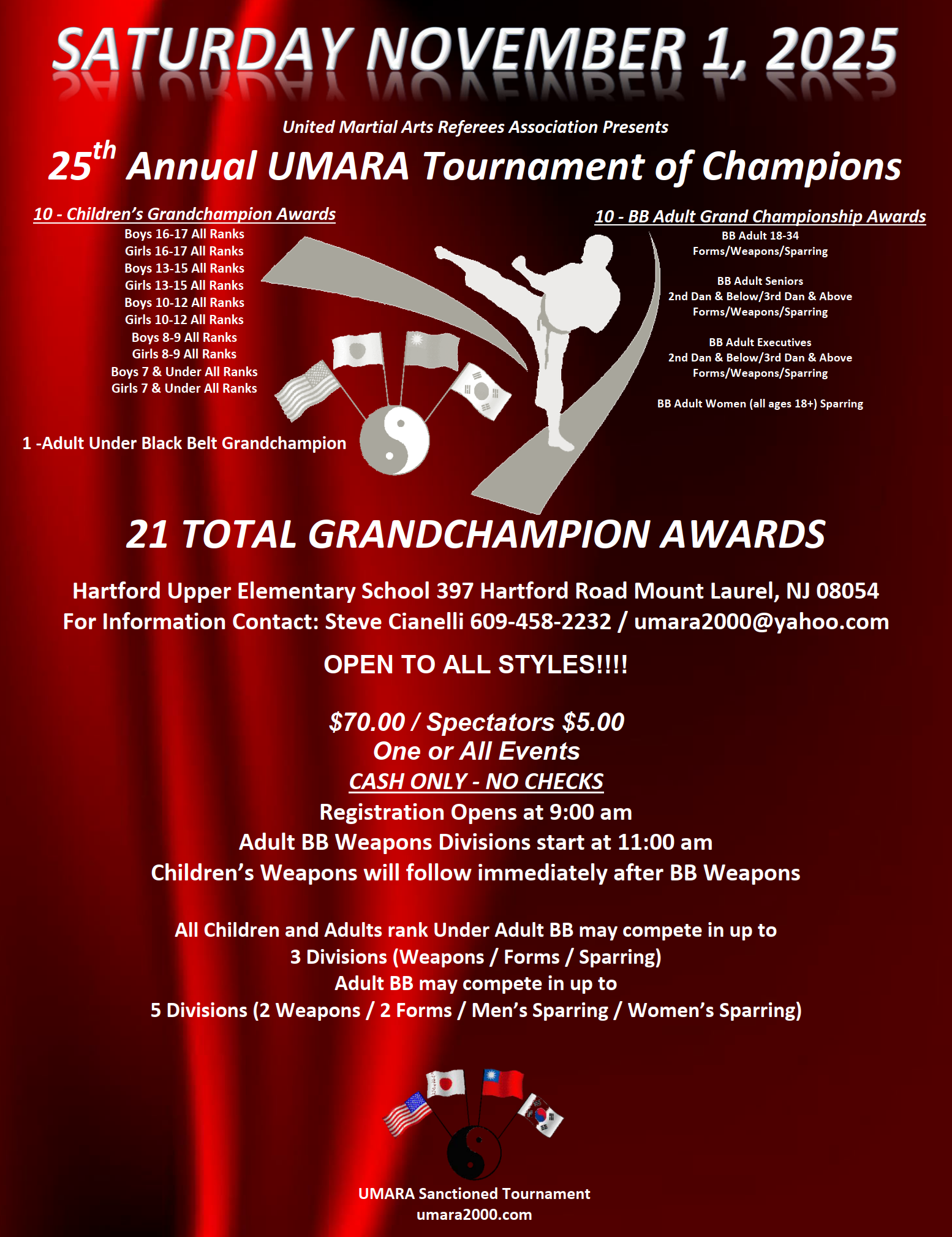 PLEASE NOTE All Adult Black Belts must choose to compete in a Weapons or Forms Divisions or alternatively participate in JUDGING throughout the day to qualify for Sparring. This includes all Defending Sparring Grandchampions.